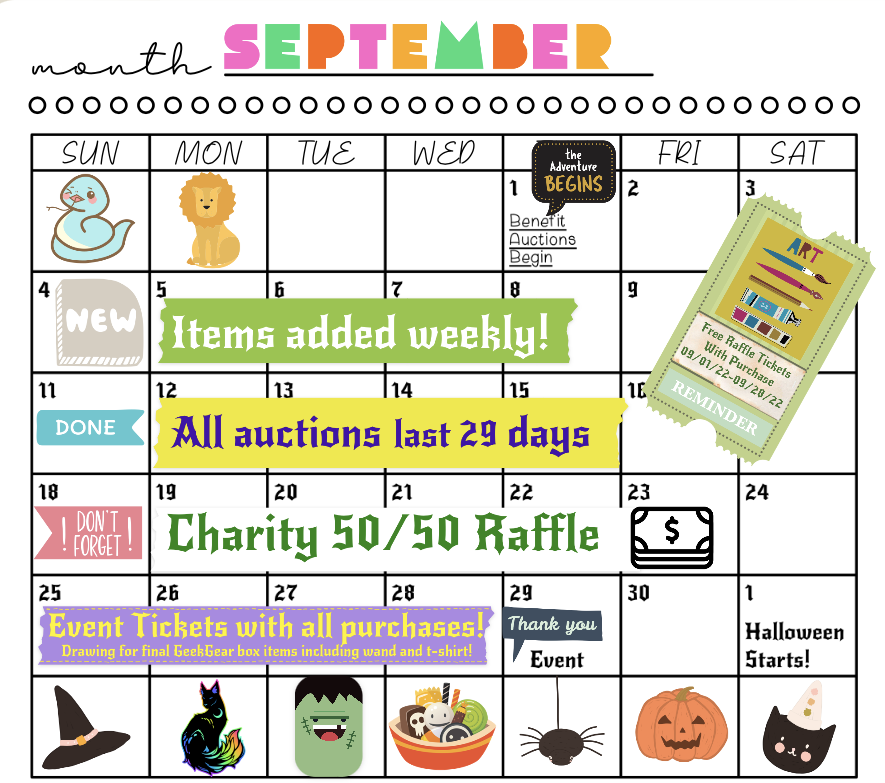 The whole month of September, we will be adding new art and items to the event. Please check back weekly as we will be taking donations until the 15th of September. Every purchase receives free entries into the event raffles to win items from the final GeekGear box. All auctions will last for 29 days from the post date. We will also be hosting a 50/50 Split the Cauldron drawing as well. On the 1st and 29th of September, we will be hosting games, trivia, coloring pages, etc for all to enjoy. We will post every weekend of the month more fun little extras to enjoy. On the 29th, the 50/50 and event drawing will be held and posted both on Facebook and here on this site.