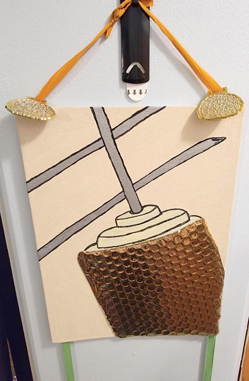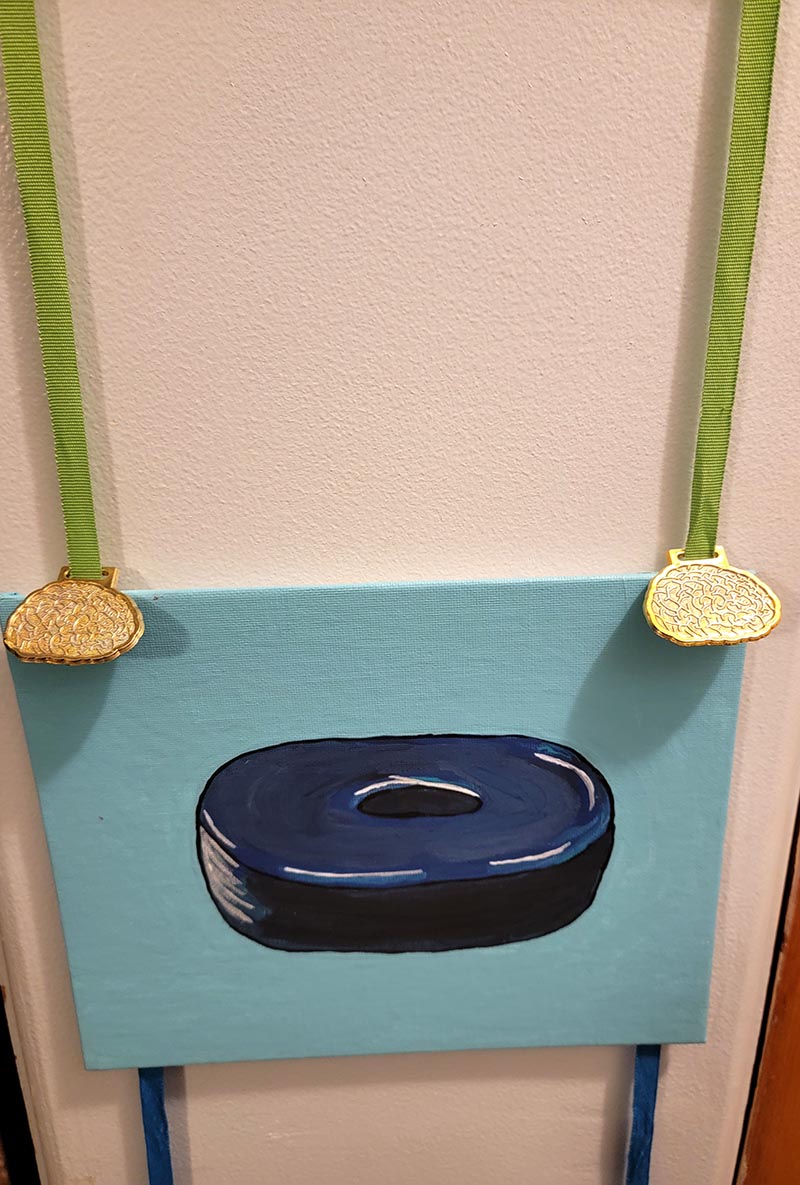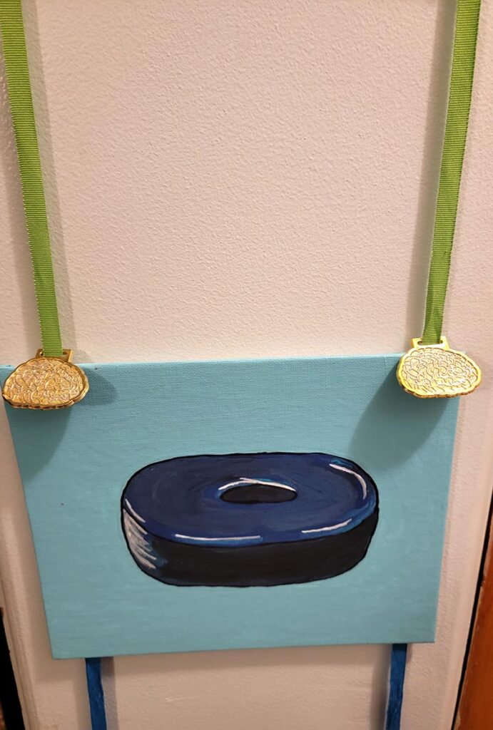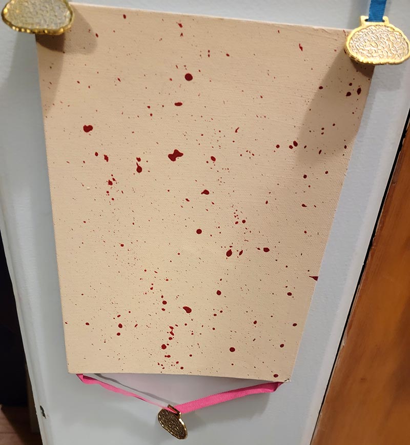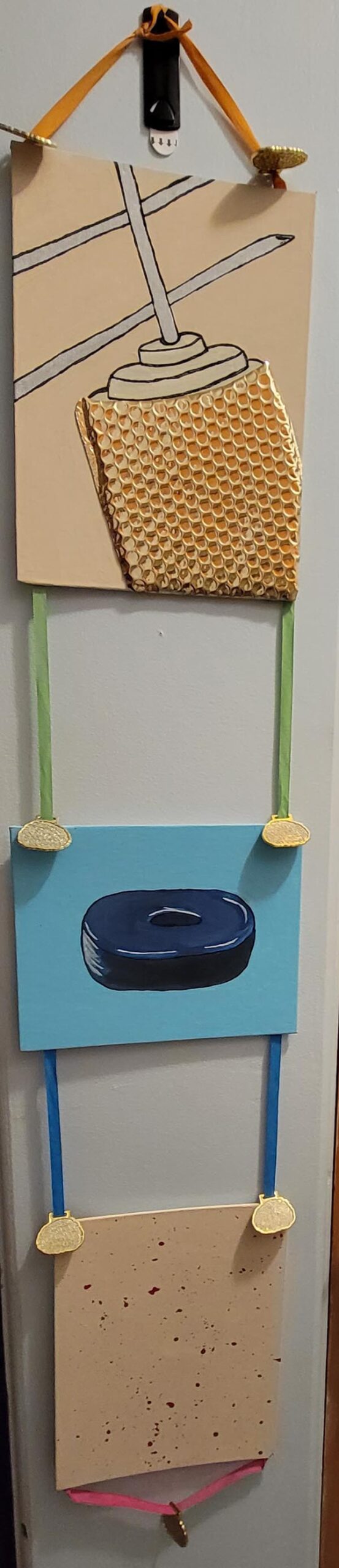 Included are the following pieces: ‘Agliophobia’- (9”x12”), ‘Radiation Ring’- (8”X10”), ‘Petechiae’- (9”x12”), in acrylic are combined with strips of hand painted brain shaped plastic award medals in three colors. It hangs from a knotted ribbon and has an extra hanging brain at the base.