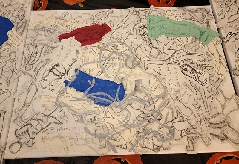 Created from all my gesture drawings from over 3 years of animation and life drawing courses along with my first ever gesture paintings. This three-painting set is completed on 18”x24” stretch canvas, pencil, charcoal, Acrylic paint, and Modge Podge. To make these more accessible, I have split this into 3 separate auctions with the bidding located under each piece individually. This is a three-minute timed painting but includes all times for the collage base.